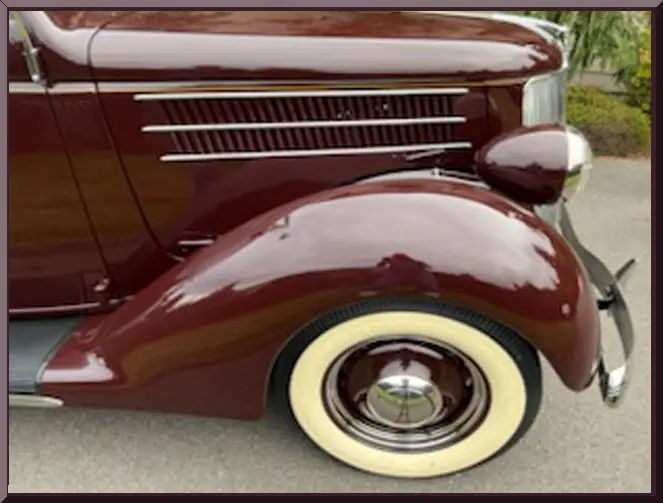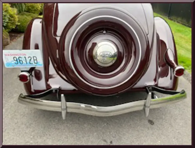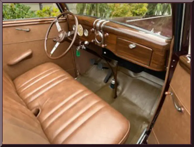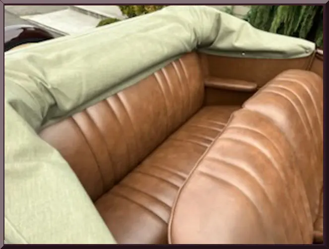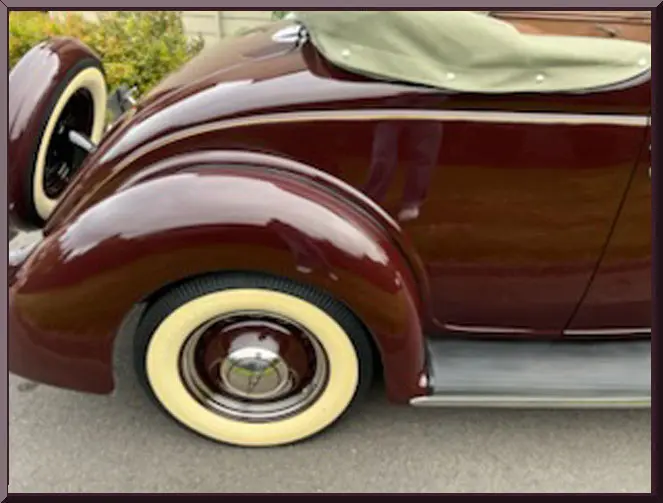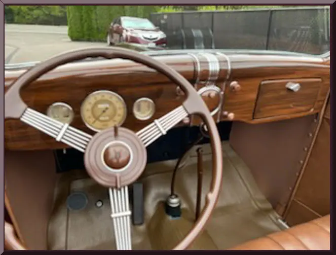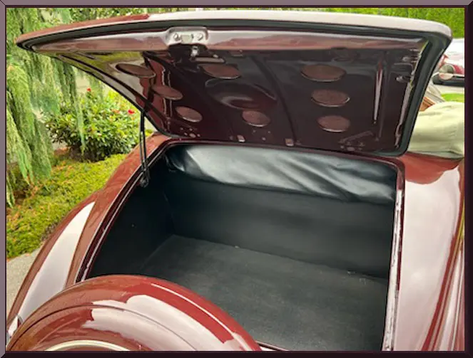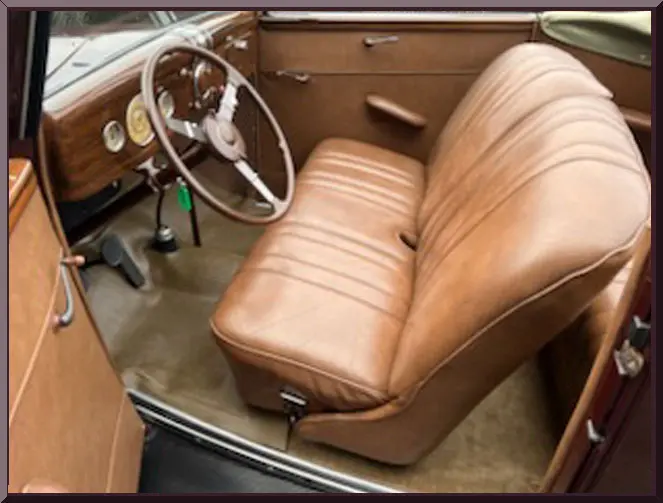 Please be sure to mention the specific vehicle you are inquiring about so we can respond promptly. A classic maroon convertible vintage car with whitewall tires parked outdoors. Front view of a vintage maroon car with chrome details and round headlights. A vintage maroon convertible car with whitewall tires parked on a driveway. Classic vintage convertible car parked outdoors with whitewall tires. Close-up of a vintage car's rear wheel with whitewall tires and maroon paint. Rear view of a vintage car showcasing its spare tire and bumper. Open car trunk showing clean, empty storage space. Vintage car's tan leather back seat with green fabric trim. Close-up of a classic car's maroon fender and whitewall tire. Interior of a vintage car with tan leather bench seat and classic steering wheel. Interior of a vintage car with tan leather bench seat and classic steering wheel. Vintage car interior with wooden dashboard and classic steering wheel. Close-up of a vintage car engine in a maroon vehicle.