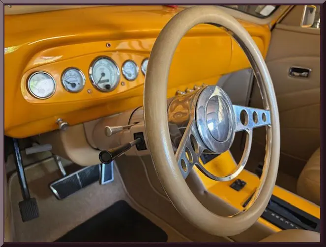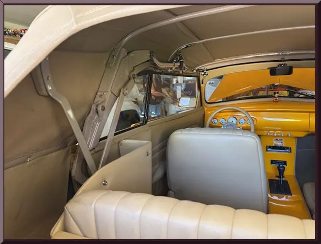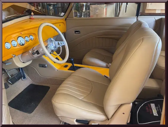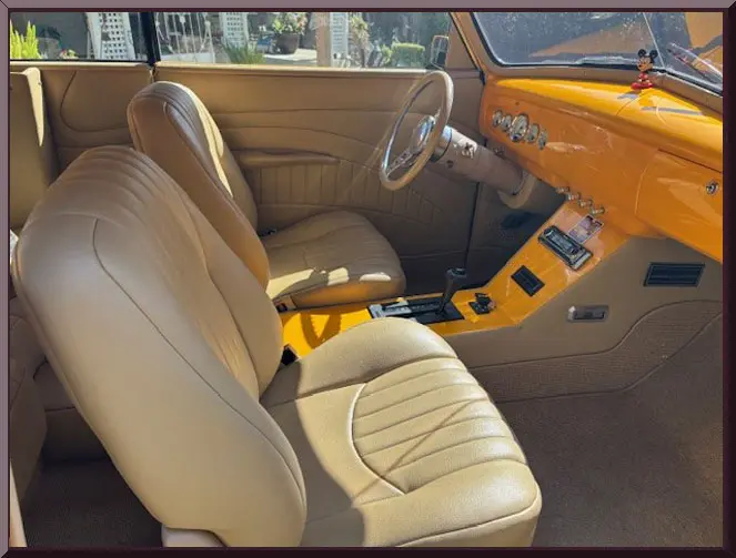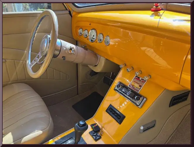 Please be sure to mention the specific vehicle you are inquiring about so we can respond promptly. Bright yellow classic convertible car parked on a driveway under sunlight. Front view of a classic orange vintage car with chrome grille. Classic yellow vintage car parked on a sunny street. Bright yellow classic convertible parked outdoors with beige soft top. Bright orange classic car with chrome details parked outside. Rear view of a vintage yellow convertible with a personalized license plate. A bright orange vintage convertible car parked on a driveway in sunlight. Open trunk showing packed items including a cooler and paper towels. Undercarriage view of a vehicle showing the exhaust and rear axle. Bright yellow classic convertible parked outdoors with beige soft top. Interior of a vintage yellow car showcasing classic dashboard and steering wheel. Interior of a classic car showcasing tan leather seats and a vintage dashboard. A clean, detailed engine bay with a polished 16-valve engine inside an orange vehicle. Interior of a classic car with beige leather seats and a yellow dashboard. Classic car interior with wooden steering wheel and vintage gauges.