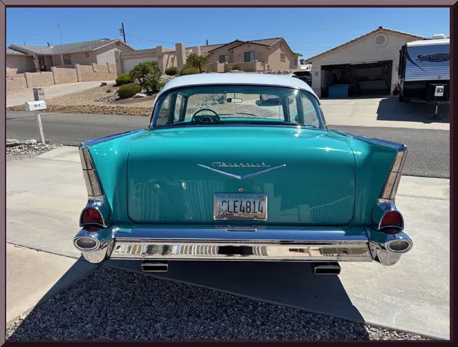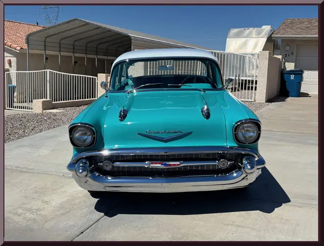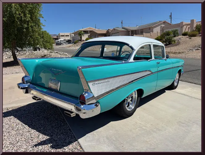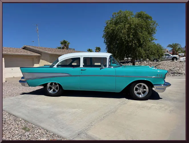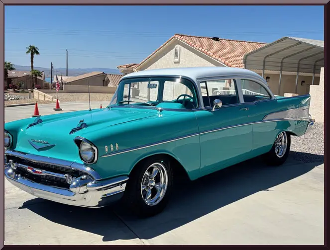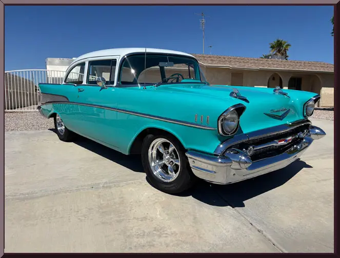 Classic Car Marketing, Inc. Southern California’s premier marketing company is pleased to introduce this new listing offered for sale by one of our clients. This 1957 Chevy 210 2 Door Sedan is a four year, frame off restoration with only 1,200 miles on the build. Powder coated California fully boxed frame, all stainless straightened and polished, re chromed front California one piece front bumper, new aluminum rear side inserts, new rear bumper and tail light assemblies, sound proofing on floor and trunk, all new glass and rubber seals, new fuel tank and fuel pump with Corvette pressure regulator and return, and fresh base coat clear coat paint. Power in this classic is supplied by an LS 5.3 V8 backed by a 4L60 E automatic transmission. New aluminum radiator with two 12 inch electric fans, tubular upper and lower control arms, coil springs and shocks, 8.8 Ford rear end 3.73 gear ratio, Posi, new rear leaf springs and shocks, front and rear power disc brakes with all new booster, master cylinder and calipers, front and rear sway bars, and new painless wiring harness. Move inside to find a beautiful matching Bel Air Ciadella interior, new carpet and headliner, new seat belts front and rear, Classic Instruments, new quartz clock, power steering, new Ididit steering column with new 15 inch steering wheel, Rain Gear electric wipers, Vintage Air and Heat, and custom sound system with an original looking radio with Bluetooth, JBL front and rear speakers. All this too cool for school classic sits on American Racing 16 inch torque thrust polished rims on Grant Touring Cooper tires. Build receipts and build documentation photos are available. This one is done up right and will definitely take you back to the good old days wherever you want to take her. Offered at $66,500 OBO. Car is located in Lake Havasu, Arizona.. Inspections are encouraged before any purchase, of any vehicle, anywhere.