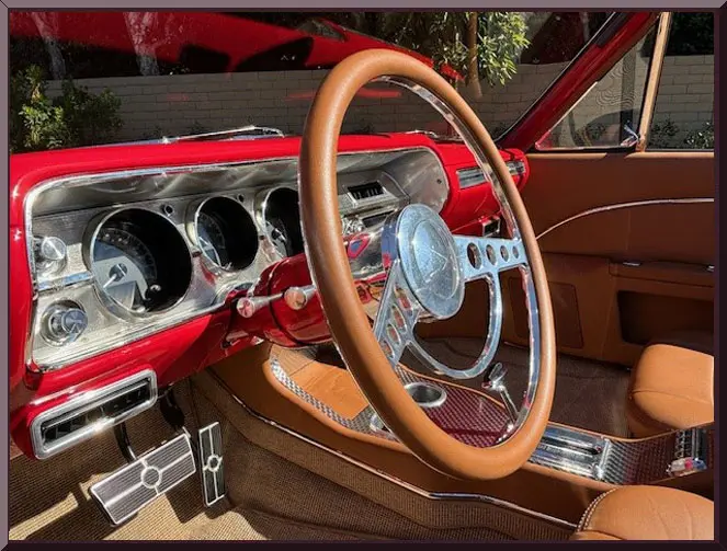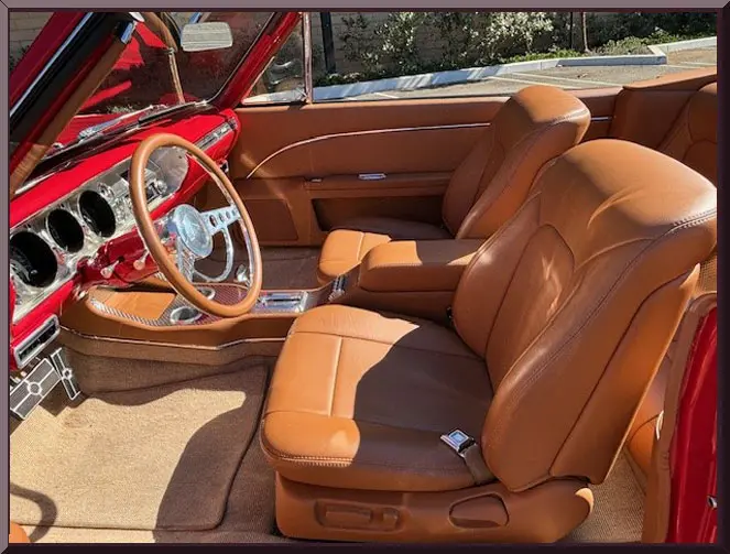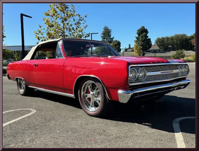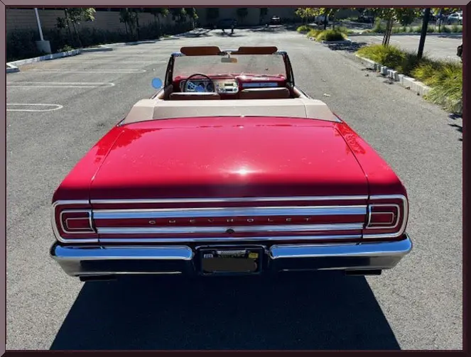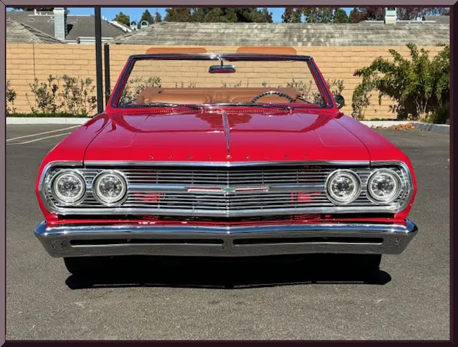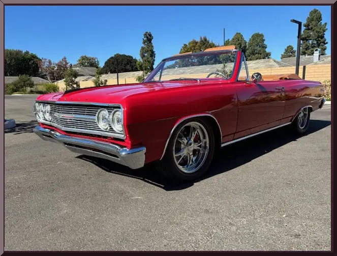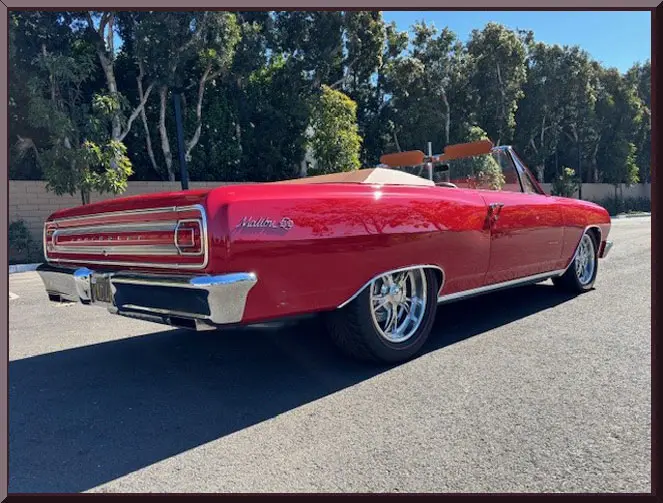 Classic Car Marketing, Inc. Southern California’s premier marketing company is pleased to introduce this new listing offered for sale by one of our clients. This 1965 Chevy Chevelle SS Resto mod is a complete frame off restoration and is a classic bitchen build all around. Body completely disassembled, with powder coated frame, and smooth firewall. Bright Red Onyx paint with 2 coats primer, 3 coats color and 3 coats clear ceramic coated paint. Power is supplied by a LS3, 495 HP with hot cam option with 4L75E transmission with high performance torque converter. Ceramic coated Universal Long tube headers with 3 inch exhaust tubing. Move inside and find a custom Ferrari leather interior with 6 way heated and cooled power seats, tilt wheel, power windows, power door locks, alarm system with electric cut off switch. Vintage Air with custom air vents molded into the dash. Digital radio with hidden antennae with sub woofer in rear trunk compartment and battery also relocated to right rear trunk compartment. Custom trunk with hidden spare tire. Interior color matched power convertible top with glass rear window and color matched custom leather parade boot. Upgrades and cool jewels include: Holly Chevelle upgraded oil pan, Lee Performance steering box, Currie 9 inch differential with 3:50 gears, custom carbon fiber drive shaft, Chassis Works front and rear suspension with tubular A arms, Chassis Works 1 1/8 front and rear G Street roll bars, Varishock QS 2 front and rear, upgraded HD Chassis package/UMI rear shock tower brace, UMI rear trailing arm brace, Baer brakes with electric parking brake, front 13 inch rotors and rear 12 inch rotors. All this sits on Schott Tomahawk aluminum wheels 17×7 front and 18×8 rear with Nieto directional red line tires to finish off the look just right. Call for pricing. Inspections are encouraged before any purchase, of any vehicle, anywhere.